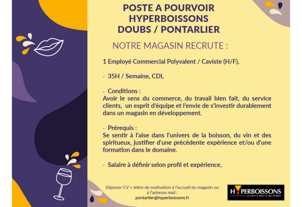 La cave Hyperboissons Doubs / Pontarlier agrandit son équipe et cherche un(e) employé(e) commercial(e) polyvalent(e) / caviste passionné(e) par l'univers des boissons. 🍻 🥂 🍷