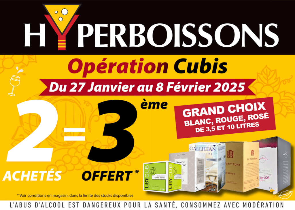 Dans vos magasins Hyperboissons Pontarlier et Viriat, profitez de l'opération CUBIS avec 2 achetés le 3ème offert.